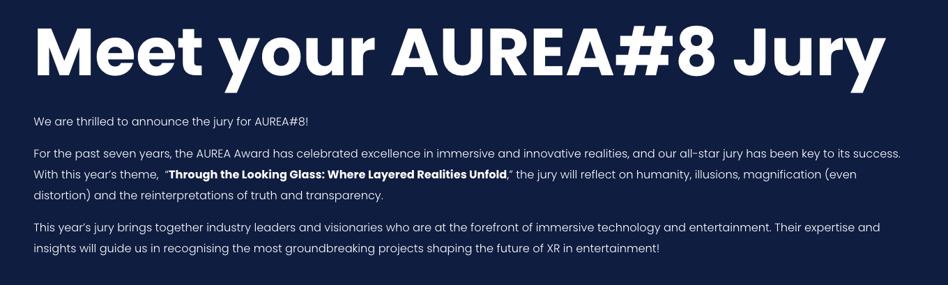 We’re proud to share that Julian Reyes, award-winning XR producer and Director of the Virtual Worlds Museum™, has been invited to join the jury for AUREA Award #8. The AUREA Awards recognize groundbreaking innovation in immersive and interactive media, and this year’s theme “Through the Looking Glass: Where Layered Realities Unfold”, explores how technology reshapes perception, truth, and storytelling.